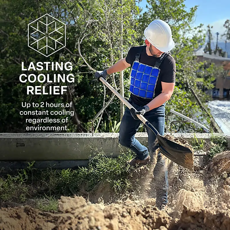 The vest delivers up to 2 hours of cooling relief. You can recharge the vest for extended cooling by re-freezing or resubmerging it in ice water.