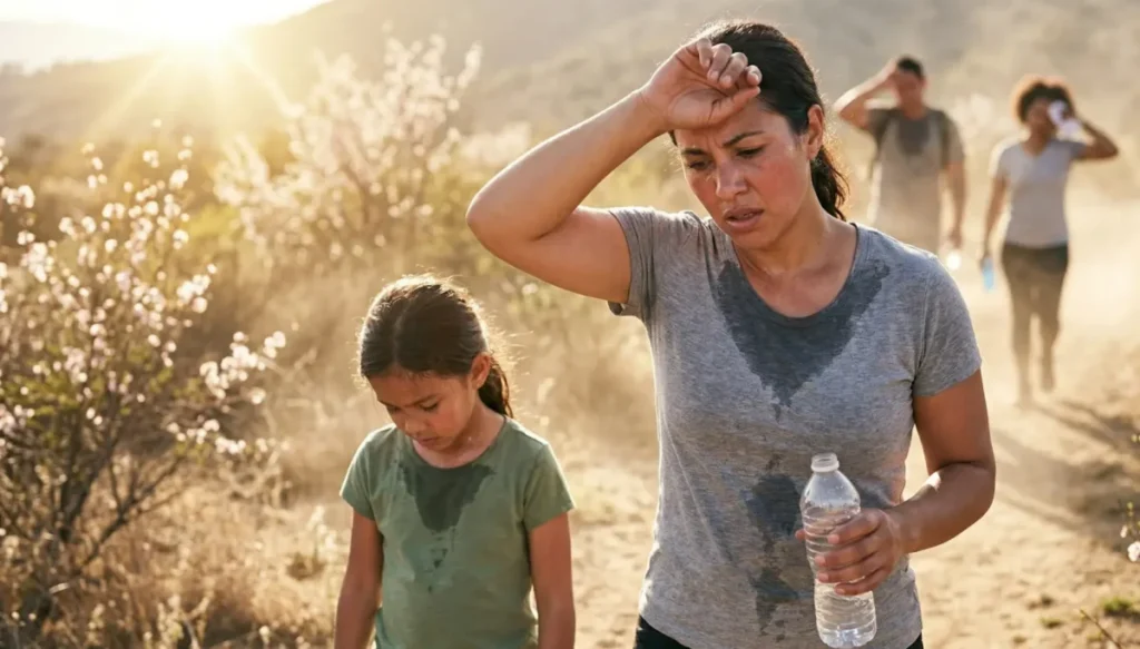 Even when the air temperature reads 60°, direct sunlight can add 10 to 20 degrees to how your body perceives heat. Add uphill climbs, backpacks, and limited shade coverage, and your core temperature rises quickly. Spring sun can be deceptively strong, especially after months of cooler weather when your body isn’t acclimated.